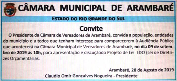 Convidamos Vereadores, Servidores do Executivo e a comunidade á participar da Audiência Publica referente a LDO 2020.