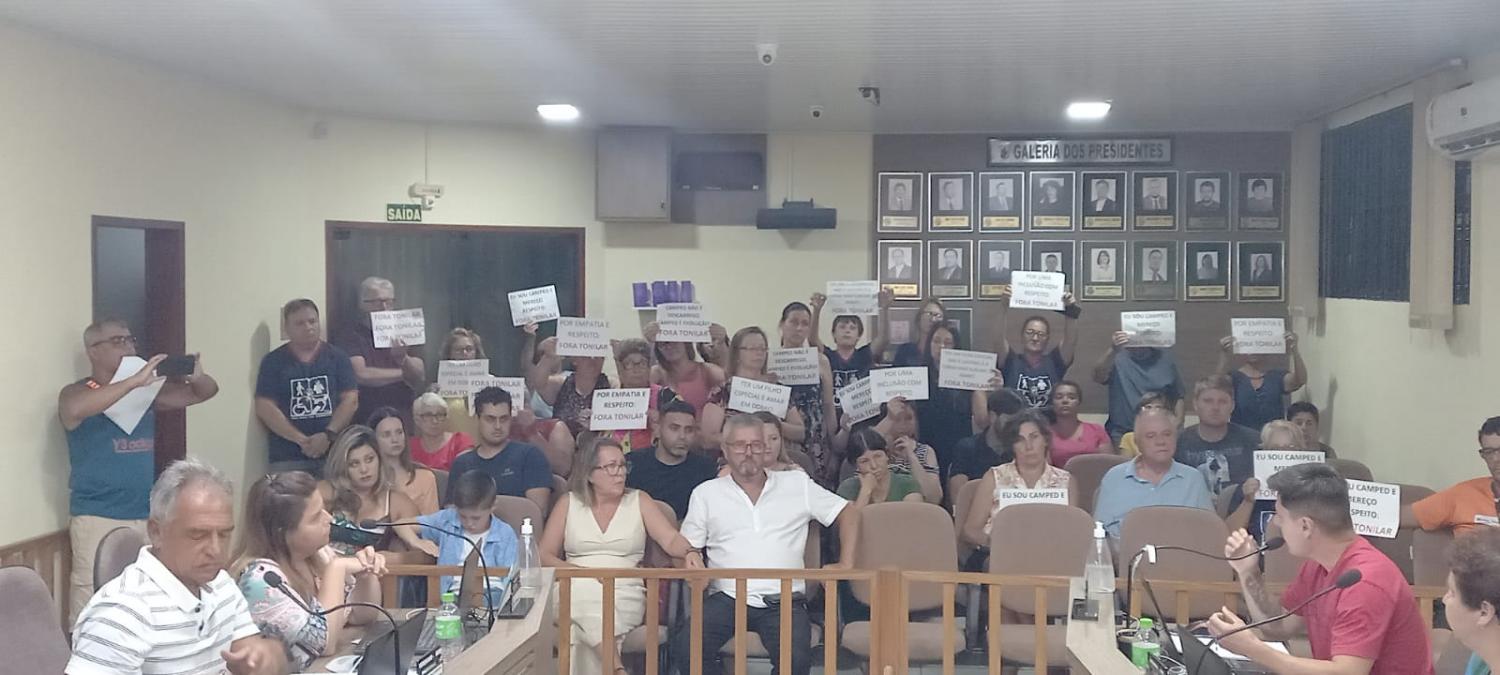 A Sessão Ordinária do dia 07 fevereiro foi marcada pela presença de um grande público que lotou o plenário da Câmara de Vereadores, alguns para prestigiar a Posse do novo Presidente, outros ostentando cartazes de protesto por atos ocorrido em reunião do Poder Executivo com profissionais e Mães do CAMPED, Centro de Atendimento Multifuncional para Deficientes.