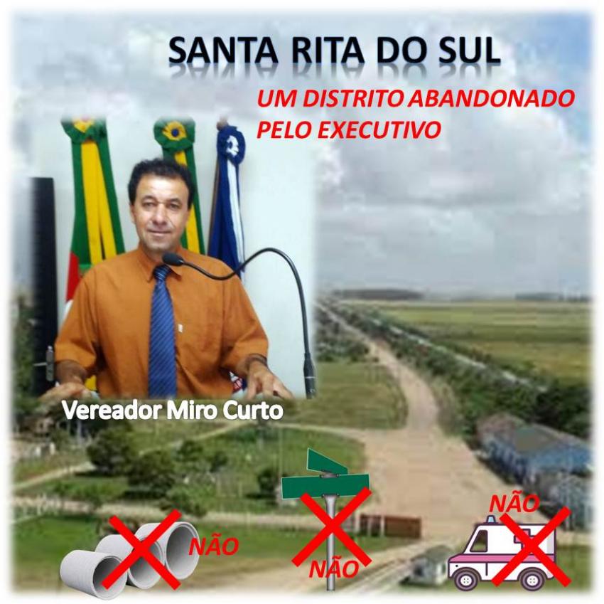 O Vereador Miro Curto PDT, vem constantemente solicitando providencias do Executivo Municipal em relação a vários problemas da comunidade do distrito de Santa Rita do Sul, em seu pronunciamentos o vereador deixa sempre claro o descaso do Executivo Municipal para com a localidade.